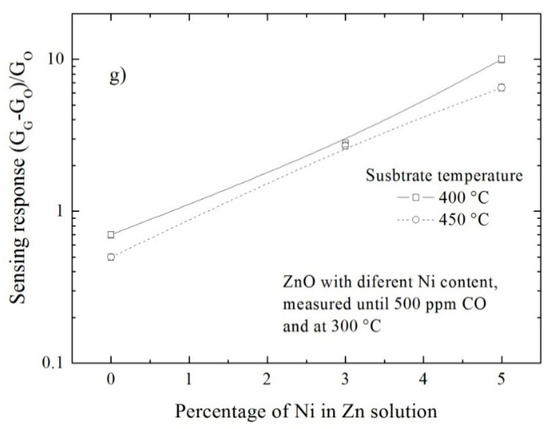 From the sensing response and surface morphology and Ni concentration results presented, we can observe four things: (a) For the undoped ZnO films, the highest sensing responses correspond to the ones deposited by USP, which is due to the fact that they have more adequate surfaces formed of small, irregular grains with good coupling, and higher effective superficial area; (b) For the doped ZnO films, the higher sensing responses correspond to the films prepared by dip coating, due to efficient incorporation of Ni impurities into the ZnO crystal lattice as evident from Table 4 and Figure 14, which is due to a higher crystalline quality, which allows for a better incorporation of the Ni in substitutional sites and, in turn, these Ni impurities favor the adsorption of oxygen molecules. The dip coating method consists of depositing one layer on top of another, the first layers are undoped ZnO and on the top are the doped layers, but it is the final annealing process, which predominantly governs the uniform distribution of impurities across the film. The dip coating technique is a process facilitating a better control of the growth parameters than the USP technique, and so deposits film with better structural properties, along with a higher proportion of the Ni impurities that stay on the surface occupying substitution sites; (c) Undoped and doped ZnO films deposited by USP at a substrate temperature of 450 °C have less sensing response than the films deposited at 400 °C, although the ZnO films deposited at 450 °C have more Ni concentration; this is because the films deposited at 400 °C have amore adequate surface morphology to detect gases (Figure 12g and Figure 13g), which is due to the fact that its surface is constituted by a greater amount of small grains and with a good coupling in between them (Table 5), creating larger quantity of grain borders; (d) From Figure 14, it is observed that a certain quantity of the Ni impurities incorporated into the ZnO crystal lattice, which makes the sensing response drop for the films deposited by both methods, which is because the Ni atoms are located mainly in the inter-grain regions, forming conglomerates or clusters, which subsequently invalidates the potential barriers and prevents the additional adsorption of oxygen molecules from the atmosphere. However, it is observed that a smaller amount of Ni concentration is required to inhibit the potential barriers in the case of films deposited by USP (Figure 14); this may be due to the fact that their size of the inter-grain regions are smaller compared to films deposited by dip coating (Figure 5 and Figure 6); more research is needed.