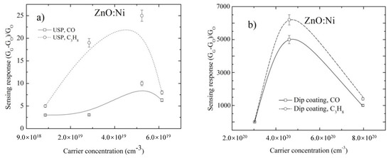 Maximum sensing response as a function of Ni concentration inside the crystal lattice for all ZnO films deposited by USP (a) and dip coating (b), measured with CO and C3H8 gases at 300 ppm and 300 °C.