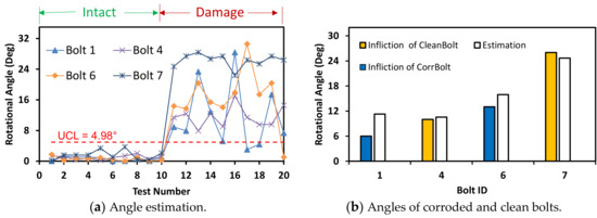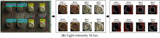 - The damage detection (i.e., bolt-loosening monitoring) of the corroded bolts was more difficult than the non-corroded bolts, which might be due to the effect of pollutants and dirt sticking on the edges of the corroded bolts. Also, the intensity of the stacked corrosion on the bolt surface changed over time, which resulted in the gradual decrease in brightness level of rust color and consequently caused the difficulty in identifying the corroded bolts.