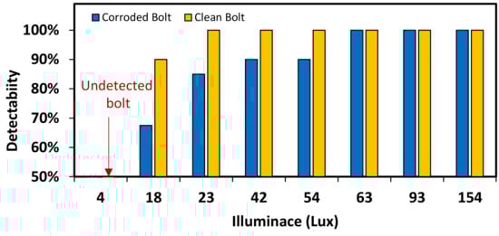 - The proposed RCNN-based deep learning method could accurately identify rusted bolts distinguished from clean ones under the perspective distortion less than 15°, the image capture distance less than 1.5 m, and the light intensity larger than 63 lux.