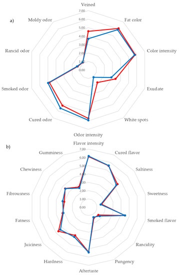 The selected parameters for appearance were veined, fat color, color intensity, exudate and white dots. For flavor, the evaluated parameters were odor intensity, cured odor, rancid odor, flavor intensity, cured flavor, saltiness, sweetness, rancidity and aftertaste. Finally, for texture the parameters were hardness, juiciness, fibrousness, chewiness and gumminess. The description and score criteria for these parameters were the same as previously selected for dry-cured ham by this sensory panel [23]. Together with these parameters, the following which were characteristic of dry-cured beef meat were also selected by the assessors: smoked odor and smoked flavor described as intensity of odor and flavor respectively produced by the presence of smoke, moldy odor described as the presence of a characteristic odor recalling that of mushrooms, and pungency described as the intensity of a pungent sensation. Other parameters such as color homogeneity, atypical aroma, fat flavor intensity, sourness, atypical flavor, heterogeneity of the texture, or chewing residue which were assessed in dry-cured ham were not included by the panel for dry-cured beef meat characterization.