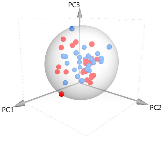 The analysis of the whole NIR spectra using SIMCA shows that after the Principal Component Analysis 4 PCs with an eigenvalue > 1 were obtained which explained the 98.8% of the total variance. The projection plot of the samples on the space defined by the three first PCs, which accounts for the 95.5% of the variance shown in Figure 3. It can be observed that both groups are not well separated. In fact, the classification obtained by OPSL-DA (orthogonal projection latent structure discriminant analysis) showed that the 68.4% of the PGI samples and the 70% of non-IGP samples were correctly classified in the calibration and only a 25% of the IGP samples and the 40% of the not-IGP samples were correctly classified in the external validation.
