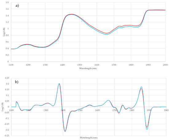 Plot of average near infrared (NIR) spectra of Protected Geographical Indication (PGI) (red) and non-PGI (blue) samples (a) without processing and (b) processed with detrend 2,10,10,1 mathematical treatment.