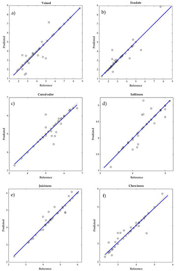 The MSEPs varied between 0.005 for moldy odor and 0.293 for veined and showed lower values than those previously found for dry-cured ham [23]. Furthermore, as in this study the lowest values of MSEP were observed in general for flavor parameters while the highest values were those of appearance attributes. The small differences between the reference and the predicted values can be seen in Figure 5 in which both sets of data are compared for some of the sensory parameters predicted.
