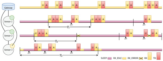 - El-Hoiydi, A.; Decotignie, J.D. WiseMAC: An ultra low power MAC protocol for multi-hop wireless sensor networks. In International Symposium on Algorithms and Experiments for Sensor Systems, Wireless Networks and Distributed Robotics; Springer: Berlin, Germany, 2004; pp. 18–31. [Google Scholar]