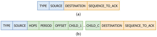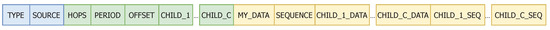 The first type of frame, BEACON (B), is used to advertise neighbours that a node exists in the coverage area. When sent by a gateway, it only carries the common part (blue part in Figure 4) because gateways are the sink nodes and are always listening on the channel (except when transmitting). When sent by sensors, they also include the green part in Figure 4), which is (i) the number of hops Hops to the gateway, which is only 2 bits and limits multi-hop to 4 hops; (ii) the time period Period and (iii) the time offset Offset with 64 bits to express each one to calculate the next awaking time accurately, and a list of at most child addresses.