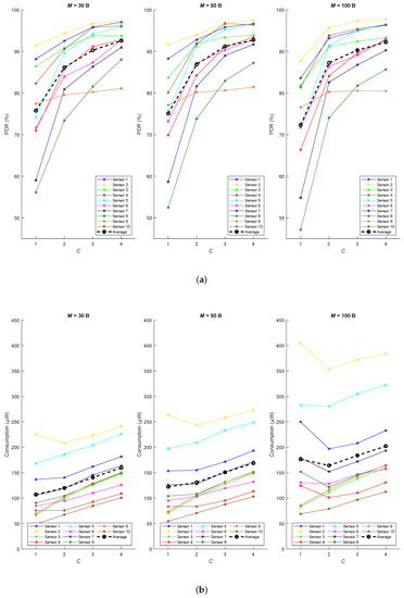 In this way, when there are many available parents p, the time period T increases to ensure that sensors keep sleeping enough time to preserve low consumption. On the contrary, the higher parameter C, the lower time period T, which avoids having extremely long delays in final message delivery. The application payload length M has also little effect in its variation, as can be seen in Table 3.