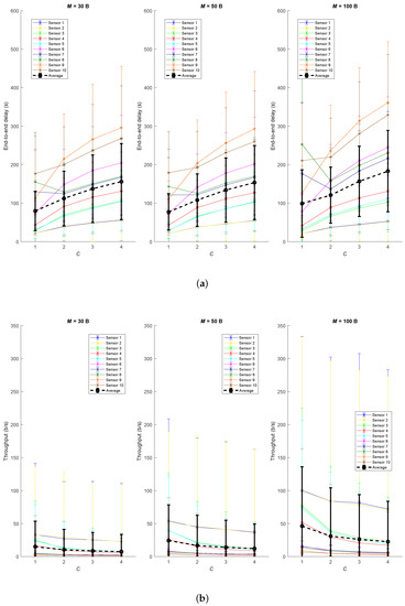 It is also worth mentioning that depending on the amount of data M, the corresponding network allows sending in the same UP_DATA frame up to children, considering the LoRa 255 bytes payload constraint. The way to calculate this limitation is expressed in Equation (2) and it limits UP_DATA and ACK frames to have a maximum length. Thus, for instance, when , the network only supports 1 children, but when it is possible to have 18 children: