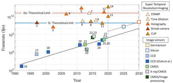 Numerous devices have been developed for high-speed imaging. However, once an image sensor has achieved a high frame rate, other devices developed for imaging for a similar frame rate were immediately replaced by a camera with the image sensor. Except silicon image sensors, there still remain the imaging devices which achieved the STR. The frame rate of about 50 ps may be achieved by an image sensor with existing technologies []. This is close to the theoretical limit. Now, it is worth exploring image sensor technologies to go beyond the theoretical limit of the Si PD.