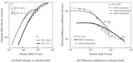 - Omar, M.A.; Reggiani, L. Drift velocity and diffusivity of hot carriers in germanium: Model calculations. Solid-State Electron. 1987, 30, 1351–1354. [Google Scholar] [CrossRef]