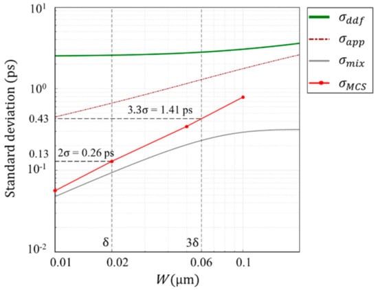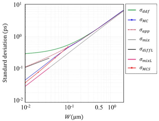 In Figure 7, the green line shows the standard deviation of the arrival time calculated by numerical integration of the expression for the DDF model shown in Appendix A with the parameters shown in Table 1. The orange dotted line shows the approximate expression of the standard deviation shown in Appendix B with the mixing component , that is due to the distribution of the penetration depth of incident light and the drift velocity, and the diffusion component . The figure suggests that:
