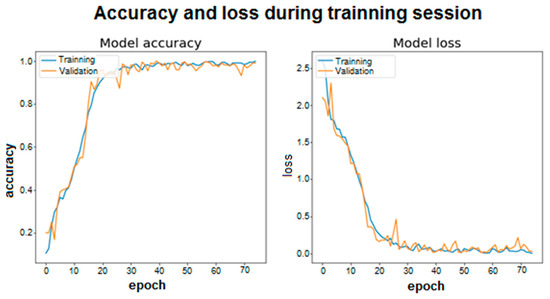 As shown, both the accuracy and the loss in each epoch are represented for the training set and the validation set. Accuracy is understood to be whether the model’s predictions of the samples match the actual label to which that sample belongs. Loss is the scalar value that tends to be minimized, since a lower value implies that the values predicted by the model are correct and correspond to the real labels of the samples. In this case, the categorical cross entropy loss function (“Categorical cross entropy”) has been used to calculate the value of loss. The two graphs are related because as accuracy increases, the loss will decrease.