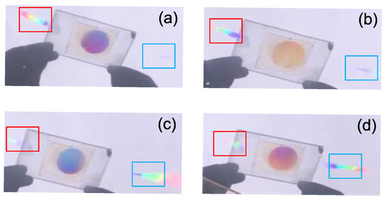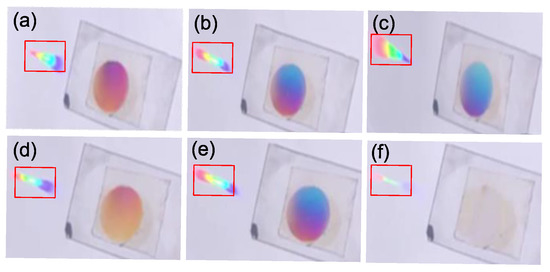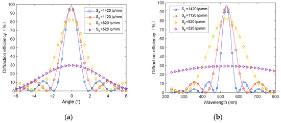 It can be seen that low diffraction efficiency is obtained at the spatial frequency of 520 lp/mm, and high diffraction efficiencies are obtained at 820 lp/mm, 1120 lp/mm and 1420 lp/mm, which are 82.7%, 94.9% and 97.5%, respectively. The corresponding operation angle ranges are 7.5°, 5.1° and 3.8°, and the corresponding working wavelength bands are 317–757 nm, 427–637 nm and 475–590 nm (all calculated by full width at half maximum). The holographic grating at 820 lp/mm has a wide wavelength band 317–757 nm, which can cover the whole visible band, and has a relatively wide working angle range and high diffraction efficiency. Therefore, we record the VPH with the spatial frequency of 820 lp/mm.
