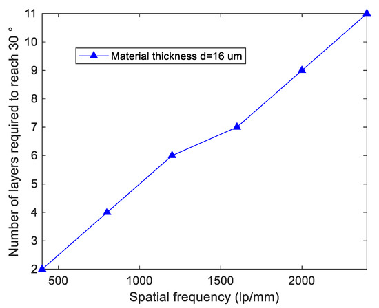 Section 2.2, it can be seen that when the material thickness is determined, the working angle of volume holography is related to the spatial frequency of the grating. Assuming that the working angle of the multilayer system is the superposition of the single-layer working system, the relationship between the number of layers required to achieve the working angle range of 30° and the spatial frequency of the multi-layer system is shown in