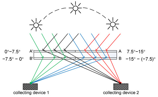 Figure 5), the sunlight will directly transmit through A′ and be converged by B′ onto the collecting device 1. For the sunlight incident from −15° to −7.5° (blue lines in