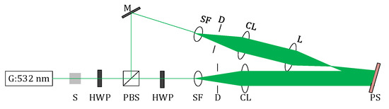 Figure 7. The light emitted by a laser having 532 nm wavelength first transmits through an electronic shutter, which is used to precisely control the exposure time. Then, the ratio of transverse magnetic (TM) polarized component to transverse electric (TE) polarized component of the light is controlled by rotating the half wave plate, which is near the laser. Thus, the energy ratio for the object wave to the reference wave can be controlled. The light is then separated into the reference wave with TM mode and the object wave with TE mode by a polarizing beam splitter. The polarization direction of the reference wave is rotated by 90° after transmitting through a half-wave plate, to satisfy the coherent interference conditions with the object wave. Finally, the reference wave and the object wave are spatial filtered and collimated. A convergent lens is used to be the object. A photopolymer substrate is placed at the intersection of the two optical paths for recording VPHs. The four VPHs of the system are recorded by turning the holographic materials, which are located at the rotating platform. The position of the converging lens is kept unchanged, to ensure the same focal length of the four volume holographic gratings.