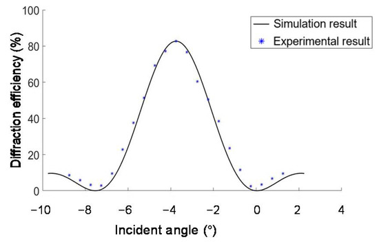 According to Equation (2), the Bragg angle for a recording wavelength 532 nm can be obtained. It can be seen from