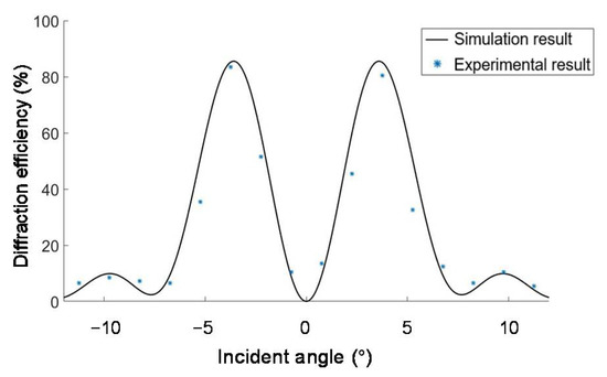 22]. In Kogelnik coupled wave theory, the effect of VPH is considered to be the energy exchange process between the incident wave and the diffracted wave. The diffraction efficiency is defined as the ratio of the diffracted wave’s intensity to the incident wave’s intensity, where the absorption by the holographic material is ignored. According to Kogelnik coupled wave theory, the diffraction efficiency of a transmission volume phase hologram can be expressed by