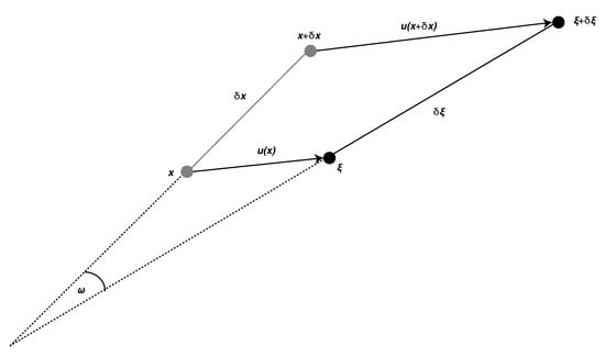 We assume that is arbitrarily small so that can be expanded as using a first-order Taylor series. The relative displacement between the two points can thus be described by