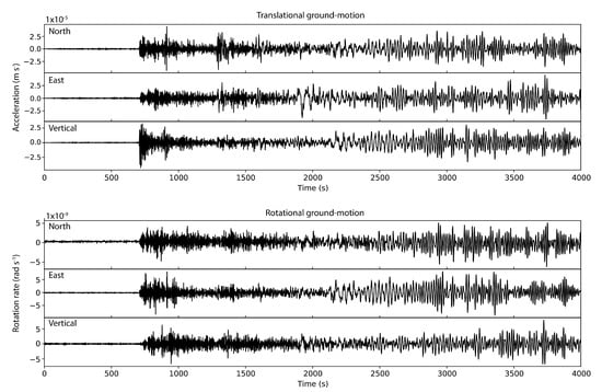 On 23 January 2018, a magnitude 7.9 earthquake occurred in the gulf of Alaska. Seismic waves of the event were recorded on the newly-opened multi-component ring laser observatory ROMY in Fürstenfeldbruck, Germany [,], resulting in the first direct observations of all six degrees of freedom of ground motion of a teleseism. The recorded data is shown in Figure 2. The data is low-pass filtered so that it only contains frequencies up to 1 Hz. Here, we will illustrate the array-like processing that can be applied to this single-station data in order to extract wave parameters and to estimate the wave type of different arrivals. This section should serve as a short introductory tutorial into 6DOF data processing. Data and Python codes to reproduce the processing examples that are discussed in this section are provided alongside this paper and can be accessed at https://github.com/solldavid/6DOF_processing_tutorial. Please refer to the Jupyter Notebook provided in this repository for instructions on how to use the codes.
