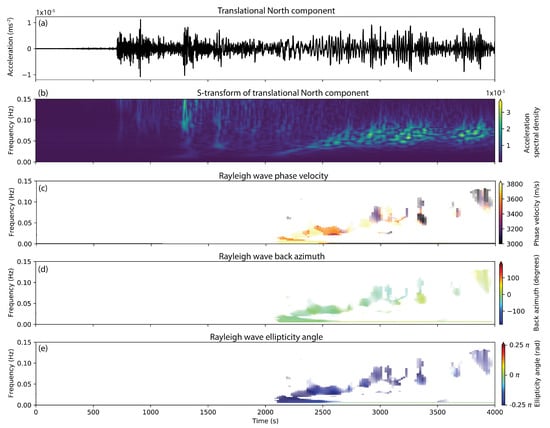 Additionally, the wave-mode filtering capabilities of 6DOF measurements also become apparent when looking at the results in Figure 4. As mentioned above, wave parameters are only plotted where the best-fitting wave parameter model resulted in a likelihood value larger than 0.7 in the estimator described in Equation (26). The large blank areas in Figure 4c–e indicate that for the early body-phase arrivals, the Rayleigh wave model only poorly fits the data. The reason for this is that the 6DOF ground-motion pattern is unique for each wave type [], meaning that, if another wave type is dominant in the analysis time-frequency window, no parametrization of the Rayleigh wave 6DOF polarization vector exists that causes it to lie parallel to the dominant polarization direction in the data .
