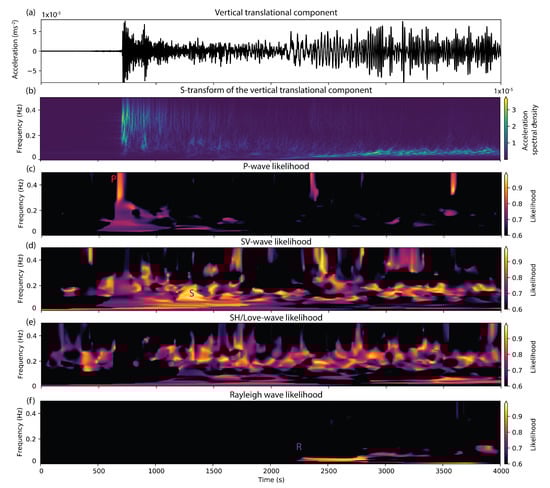 Sollberger et al. [] provide 6DOF polarization vectors for all wave types that can be fitted to match the direction of using the same estimation scheme that is described above. The results of performing such an analysis are shown in Figure 5. The first two panels show the vertical component seismogram of translational motions of the gulf of Alaska earthquake (Figure 5a) and its S-transform (Figure 5b) up to frequencies of 0.5 Hz. The following panels show the color-coded likelihood values (value of the exponential in the estimator described in Equation (26)) for the best-fitting polarization models of the four wave types P, SV, SH/Love, and Rayleigh. High values indicate that the polarization model fits the data at a specific time-frequency pair. Since the 6DOF polarization models are unique for each wave type, the results can be used to automatically classify the different arrivals in terms of their wave type. Several arrivals seem to be classified correctly by the algorithm, such as the direct P wave (marked in red in Figure 5c), the direct S-wave (marked in blue in Figure 5d, and the Rayleigh waves (Figure 5f, as already discussed above). Note that a significant amount of S-wave energy seems to be detected by the algorithm in between the direct P- and the direct S-phase. This could be explained by P-to-S-scattering in the Earth’s crust.
