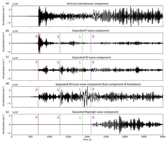 Sollberger et al. [] demonstrated that, at the free surface, the 6DOF ground motion pattern of plane waves is unique for each wave type (P-, SV-, SH/Love-, and Rayleigh-waves) and that the wave types of two interfering arrivals can be estimated simultaneously using a single 6DOF station. This allows one to automatically separate the recorded data into contributions from different wave types (see the example given in Section 3.1.3).