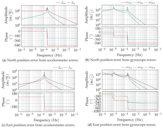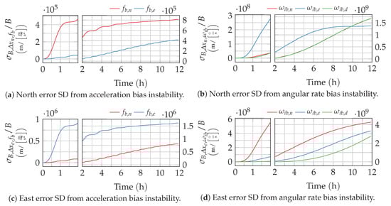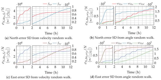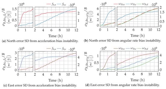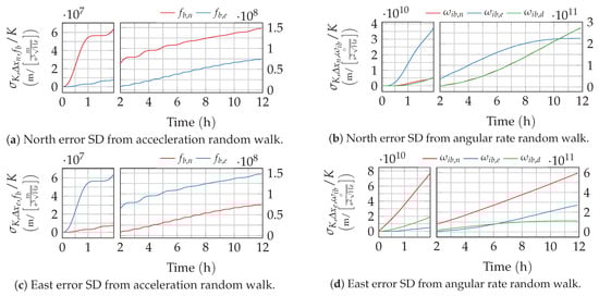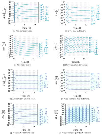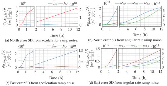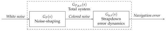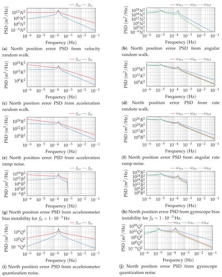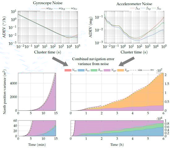 The growth of navigation state errors (position, velocity and orientation) from the above described inertial sensor errors is defined by the navigation system’s error dynamics. The error dynamics of platform and, more importantly, strapdown inertial navigation systems is, in general, well covered in the literature. An extensive discussion of inertial navigation error dynamics is, e.g., given in the works of Britting [], Savage [] and Chatfield []. This includes analytical expressions of the position error’s growth from both initialization errors and sensor biases. Short- and medium-term approximations of these expressions can also be found in [,,]. While these allow for the analysis of bias-like errors e.g., run-to-run bias variations, the system’s response to noise-like errors is rarely covered. With the advent of optical gyroscopes, the random walk noise became more significant compared to the previous mechanical gyroscopes, which leads to increasing interest in the propagation of gyro noise []. With the proliferation of micro-electro-mechanical system (MEMS) sensors and their complex error behavior [,], considering colored noise and especially long-term processes has again gained in importance. Still, publications are limited to considering white Gaussian noise, e.g., [,] or quantization noise of integrating sensors [] for predicting the navigation performance.