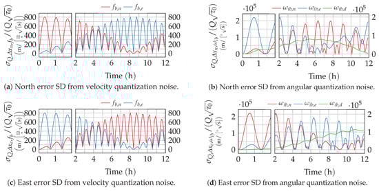 Similarly, the other noise processes become significant for long-term navigation only. As illustrated in Figure 12, the contribution of the quantization noise is worst for short times. Still, from the charts, it can be determined whether a certain level of quantization noise can be neglected, independent of the mission duration.