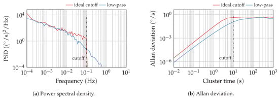 In reality, however, the measurement noise of inertial sensors indeed contains time-correlated components that are represented by various noise processes, as pointed out in e.g., [,,]. State of the art is the identification and analysis of the sensor noise processes using the power spectral density (PSD) and Allan variance [] as demonstrated in [,,]. Based on these two methods, the Institute of Electrical and Electronics Engineers (IEEE) standards on specification and testing of various inertial sensor technologies [,,,] define five typical noise processes that can be found in inertial sensor noise and is covered in this publication: