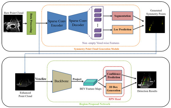 Three-dimensional object detection from point cloud data is becoming more and more significant, especially for autonomous driving applications. However, it is difficult for lidar to obtain the complete structure of an object in a real scene due to its scanning characteristics. Although the existing methods have made great progress, most of them ignore the prior information of object structure, such as symmetry. So, in this paper, we use the symmetry of the object to complete the missing part in the point cloud and then detect it. Specifically, we propose a two-stage detection framework. In the first stage, we adopt an encoder–decoder structure to generate the symmetry points of the foreground points and make the symmetry points and the non-empty voxel centers form an enhanced point cloud. In the second stage, the enhanced point cloud is input into the baseline, which is an anchor-based region proposal network, to generate the detection results. Extensive experiments on the challenging KITTI benchmark show the effectiveness of our method, which has better performance on both 3D and BEV (bird’s eye view) object detection compared with some previous state-of-the-art methods.