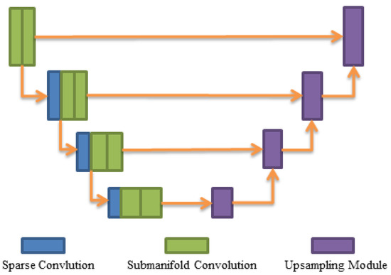 In practical applications, we cannot directly calculate the location of a symmetry point using Equation (1) for the data that we have not labeled. So, we need a network that can segment the foreground points and predict the positions of their symmetry points. To accomplish these two tasks, we use a feature extractor similar to UNet [26] proposed by [27] to extract non-empty voxel-wise features. The network structure is shown in Figure 3, which is mainly composed of sparse convolution layers and submanifold convolution [28] layers. The encoder uses three sparse convolutions with stride 2 to downsample the spatial resolution eight times. Each sparse convolution layer is followed by two submanifold convolutions. The decoder uses four upsampling blocks to restore the spatial resolution to the original scale so that we can get effective non-empty voxel-wise feature representation. After the decoder, a segmentation head and a regression head are added to segment the point cloud and estimate the positions of the symmetry points, respectively.