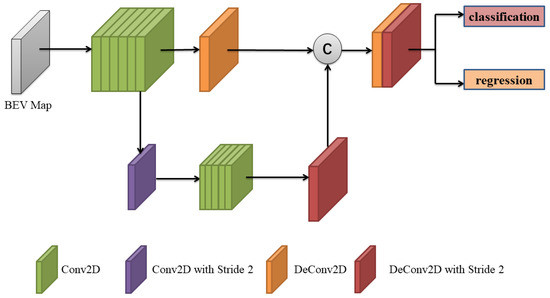 The region proposal network consists of a backbone network and a detector head. The backbone network has the same structure as the encoder in the first stage and only adds a sparse convolution after the encoder to compress the height of the feature volume. The enhanced point cloud is divided into voxels with a spatial resolution of . The feature volume extracted by the backbone network is downsampled eight times, which can be expressed as a tensor form . After that, the height channels of this feature are compressed into BEV representation, represented as . Then, we apply the RPN head shown in Figure 4 to 3D box classification and regression, which is similar to SSD [30].