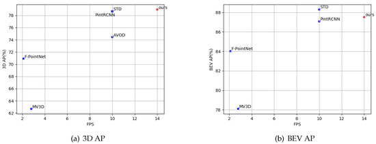 We compare the performance of our proposed EPGNet with some previous state-of-the-art methods on 3D and BEV object detection using the KITTI validation set. To fully compare the various methods, we chose the single-stage and two-stage methods with different modalities. At the same time, we bold the relevant values in Table 3 to highlight the optimal value of each metric. KITTI uses the moderate level of 3D object detection as the most important metric for detector performance. It can be seen from Table 3 that our EPGNet has achieved competitive results in both 3D and BEV object detection; it has reached the top in 3D object detection, and is superior to most algorithms in BEV detection. In order to show the superiority of our algorithm more intuitively, we write the APs at the moderate detection level for two-stage algorithms in Table 3 and show them in Figure 5. The horizontal axis represents the frame rate, and the vertical axis represents the AP. The closer the algorithm is to the upper right corner, the better its performance.