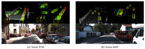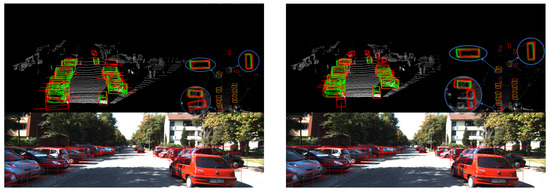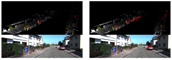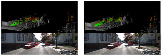 As we know, the KITTI dataset ignores objects that are too far away from the lidar or that are seriously occluded when labeling data. As shown in Figure 7, although the baseline performance is excellent, our network performance is even better, as unlabeled cars can be detected.