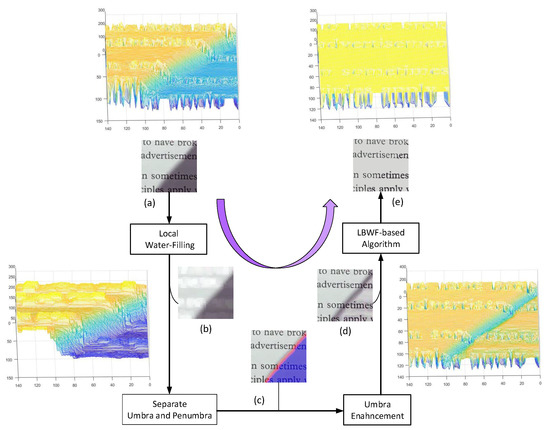 The flowchart of the proposed method is presented in Figure 2. Firstly, the proposed local water-filling (LWF) algorithm receives an input image with shadows and generates a shading map (see Figure 2b) which represents local background colors of the input image. The shading map can be used to detect umbra (the red) and penumbra (the purple) (as shown in Figure 2c). Then, the umbra can be relighted according to Retinex theory (Figure 2d). Finally, a local binarized water-filling-based (LBWF-based) algorithm was designed to remove the shadow boundaries and produce an unshadowed image (Figure 2e). Notably, Figure 2 shows the topographic structures of the image (a), (b), (d) and (e), indicating how the topographic surface changes.