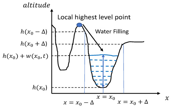 We set as the altitude of the topographic surface and as the water level at a point of time t. For a point , its overall altitude is the sum of and , i.e., = + . Figure 3 illustrates a one-dimensional model of plateau and basin. Specially, an essential constraint about is given as follows