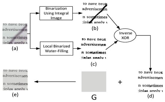 LBWF is able to produce a gray-level image with only text and background, which is indicated in Figure 4c. The penumbra between text lines can be suppressed well, which verifies the effectiveness of LBWF. To obtain a better result, a binary image (Figure 4b) is generated by the integral image-based method [20]. Then, an inverse XOR operation is carried out to produce a clearer image. Finally, the global background color G is combined with Figure 4d to generate an unshadowed result (Figure 4e). Overall, the algorithmic description is presented in the form of pseudocode, as shown in (Algorithm 1).