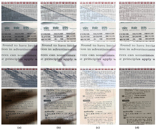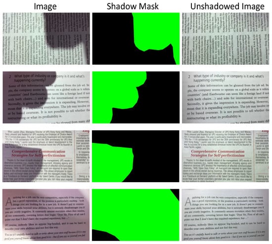 - Bako, S.; Darabi, S.; Shechtman, E.; Wang, J.; Sen, P. Removing shadows from images of documents. In Proceedings of the IEEE Conference on Asian Conference on Computer Vision, Taipei, Taiwan, 20–24 November 2016; pp. 173–183. [Google Scholar]