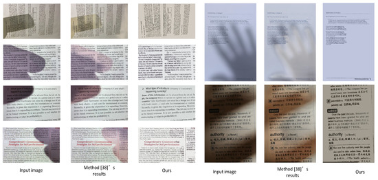 When document images are cast by shadows, the occluded regions become darker than before. It is observed that the text is always printed in black on the documents. Specifically, when the darkness of the shadows is similar to that of text, it will generate poor-quality text [9,11]. The shadows may make the perception of documents uncomfortable to the human eye and cause the degradation of text in documents or notes, which will result in difficulties for text binarization and recognition [12,13]. Therefore, removing shadows from document images not only helps generate clear and easy-to-read text [14], but also makes document binarization [15,16] and recognition tasks [17,18,19] possible.