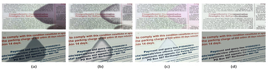 It should be noted that the results of some scenarios need to be improved, which is shown in Figure 9. When the colored text is covered with strong shadows, e.g., the red text in the first row and the blue text in the second row, the output text of our method tends to be black. The color degradation might lead to visual inconsistencies. Color constancy methods [26,27] could be considered to address this issue. In this regard, more research needs to be invested in the future.