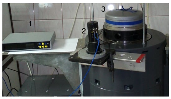 Installation of the LDG for the calibration of optical encoders; 1—RON-905; 2—adjustment ring; 3—LDG.