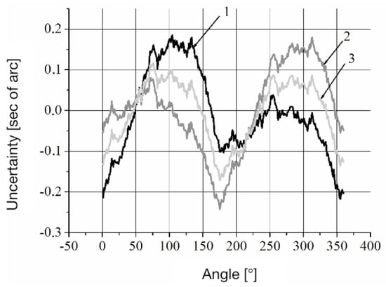 Illustration of the systematic error of the LDG: 1—RL CCW rotation; 2—RL CW rotation; 3—systematic error of the optical encoder.