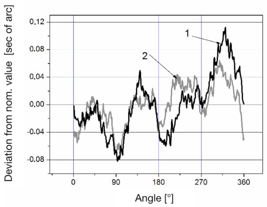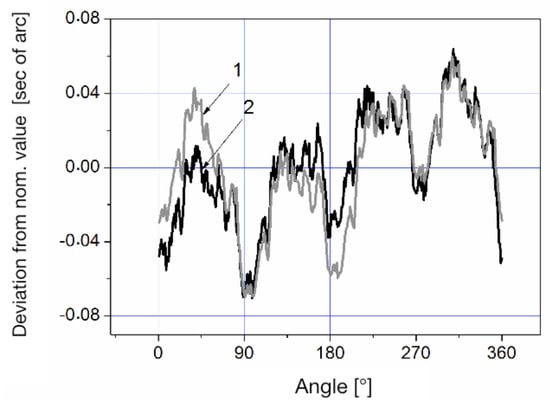 When installing the optical encoder on the LDG axis, the installation requirements set out in [] are taken into account. The simplified cross-calibration method is used to eliminate the systematic error caused by errors in installing the optical encoder on the LDG axis. Let us discuss the results of the calibration of the optical encoder RON-905 of the company Heidenhain. The RON-905 has a built-in coupling and a closed hollow rotor, characterized by a systematic error not exceeding s of arc. To ensure reproducibility of the measurement results, the manufacturer Heidenhain sets hard requirements for its installation []. The setup of the LDG with the RON-905 installed on it is shown in Figure 5.
