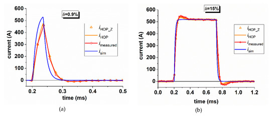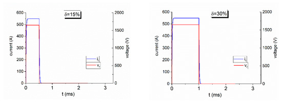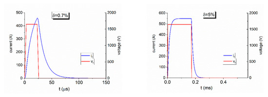δ = 0.7%, the current cannot reach the maximum expected value of 550 A because of the delay introduced by the stray inductance of the braking rheostat. For higher duty-cycles the maximum current is reached within approximately 0.1 ms.