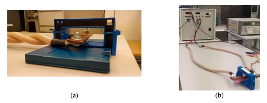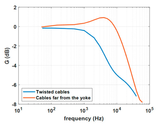 Figure 13 the effect of different primary cable arrangement is very high. The frequency behavior is compliant with the datasheet of such commercial sensor if the forward and return cables of the primary circuit of the sensor are kept far from the yoke. In fact, for case (b) the gain is about −1 dB at 10 kHz, as declared in the datasheet. The frequency band in the twisted cable configuration is considerably lower than rated, i.e., about −1 dB at 2 kHz.