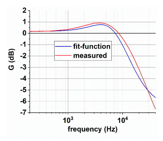 Figure 13). It can be deduced that an overshoot occurs around 5 kHz. Such behavior can be reproduced by a couple of two complex and conjugate poles. Moreover, one can note that the slope of the measured frequency dependence is lower than the expected 40 dB per decade produced by the two poles; this is taken into account by introducing a zero at about 3 kHz that reduces the slope and allows a better fit in the frequency range between a few kilohertz to 10 kHz. The description of the fit function