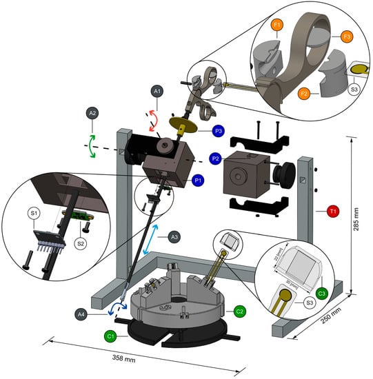 The exploded view of the LAPKaans smart laparoscopic training system and modules are shown in Figure 1. The system dimensions were designed to be compatible with an ETHICON basic tasks training set (Johnson & Johnson®, New Brunswick, NJ, USA) with similar dimensions as other trainers in the market. The Tool-Motion tracking module measures three-dimensional position at the tip of the instrument for further measurement of the path length during execution and additional tool-speed computing. In related studies, this metric is associated with the surgeon’s skills. Only a minimal modification to standard laparoscopic instruments was introduced in order to take advantage of inherent instrument’s complexity, functionality, and ergonomics. As seen in Figure 1, it consists of two instrument guides, emulating a trocar (P1) (in the next sections they will be referred to as smart trocars or trocars). They are three-dimensional (3D)-printed by Fused Deposition Modeling (FDM) made from Polylactic Acid (PLA) mounted in an aluminum support (T1). A mechanism like the Immersion Virtual Laparoscopic Interface (Immersion Medical, Gaithersburg, MD, USA) is proposed. The system features 4-degree of freedom (DOF): yaw (A1) and pitch axis (A2); translation (A3) through the insertion point (P2); and roll axis in the instrument shaft (A4). The trocar itself is cubic with a centered hole (P2) for the insertion of standard laparoscopic instruments. Inside the trocar, there are compartments for position sensors and wires hidden from the user, avoiding any movement restrictions.