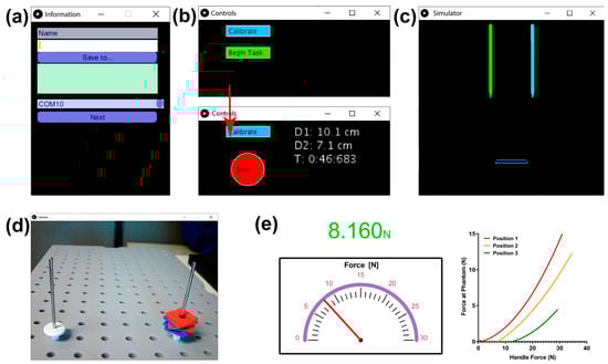 Graphical User Interface Module. (a) Initial window for entry user’s identification. (b) Control and calibration window. When the task has begun, the control window shows both tools tracked distance and elapsed time. (c) Digital twin of both tools. (d) Live video from webcam. (e) Grasping force window with numeric and graphical indicators and phantom-to-handle force graph with colors and numbers corresponding to carousel position.