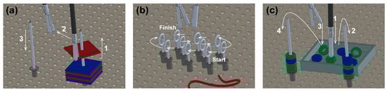 The functionality and fidelity of the training simulator were validated through 39 subjects including attending surgeons, general surgery residents, and students from our medical school. They executed a series of adapted tasks reported in past works as training assessment exercises [,], while control, simulator and live video windows (Figure 4b–d)) of the GUI were displayed on a laptop. Figure 5 shows a graphic representation of the training tasks: